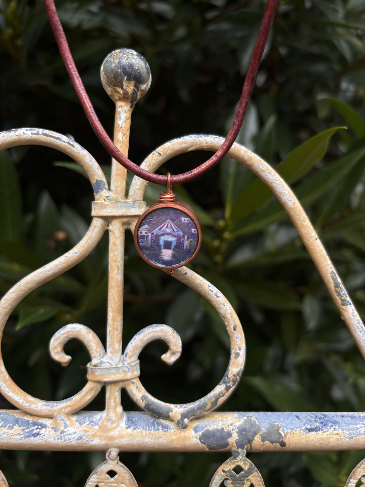 Retro Schmuckanhänger aus Kupfer mit Lederband.