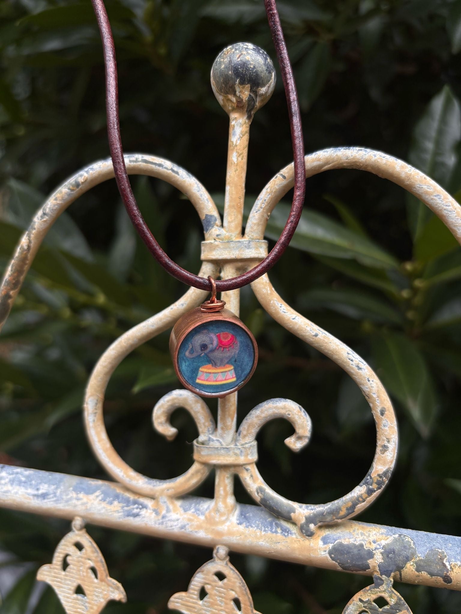 Retro Schmuckanhänger aus Kupfer mit Lederband.